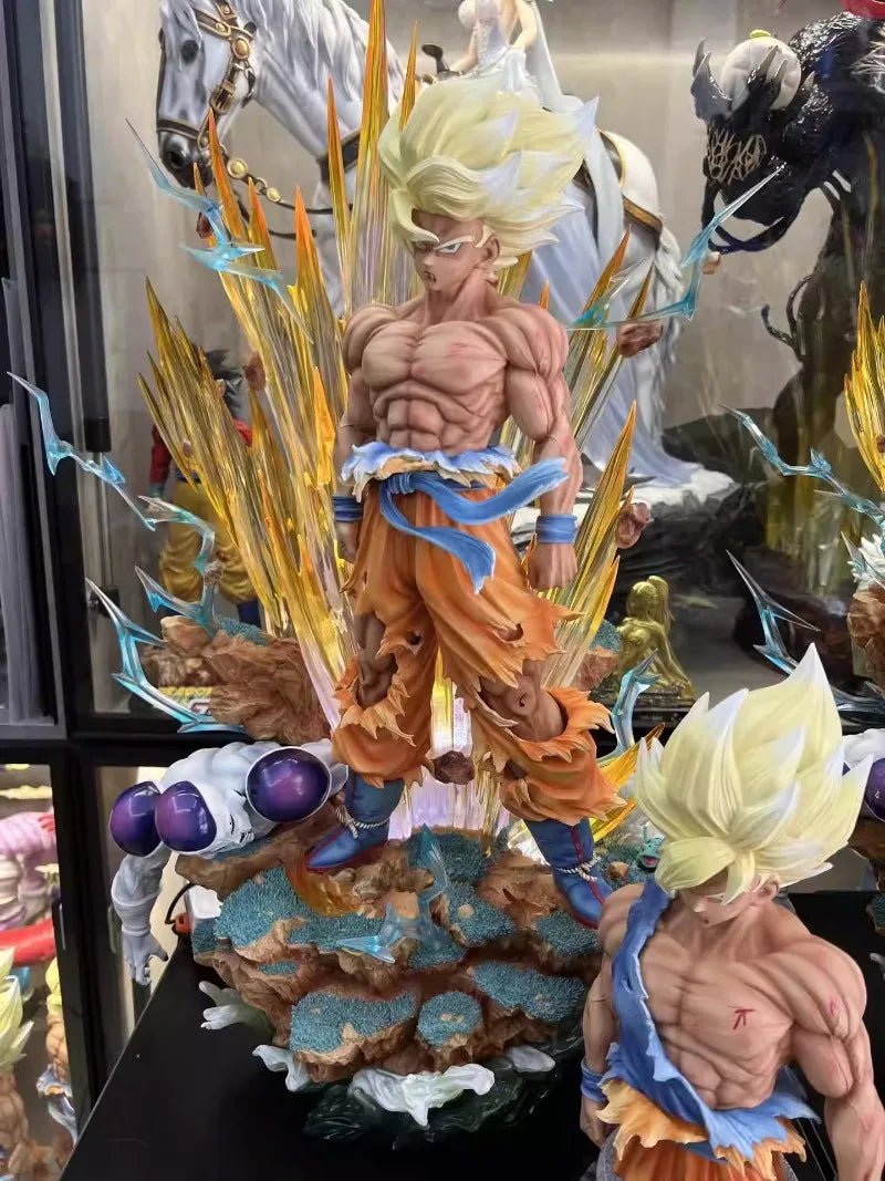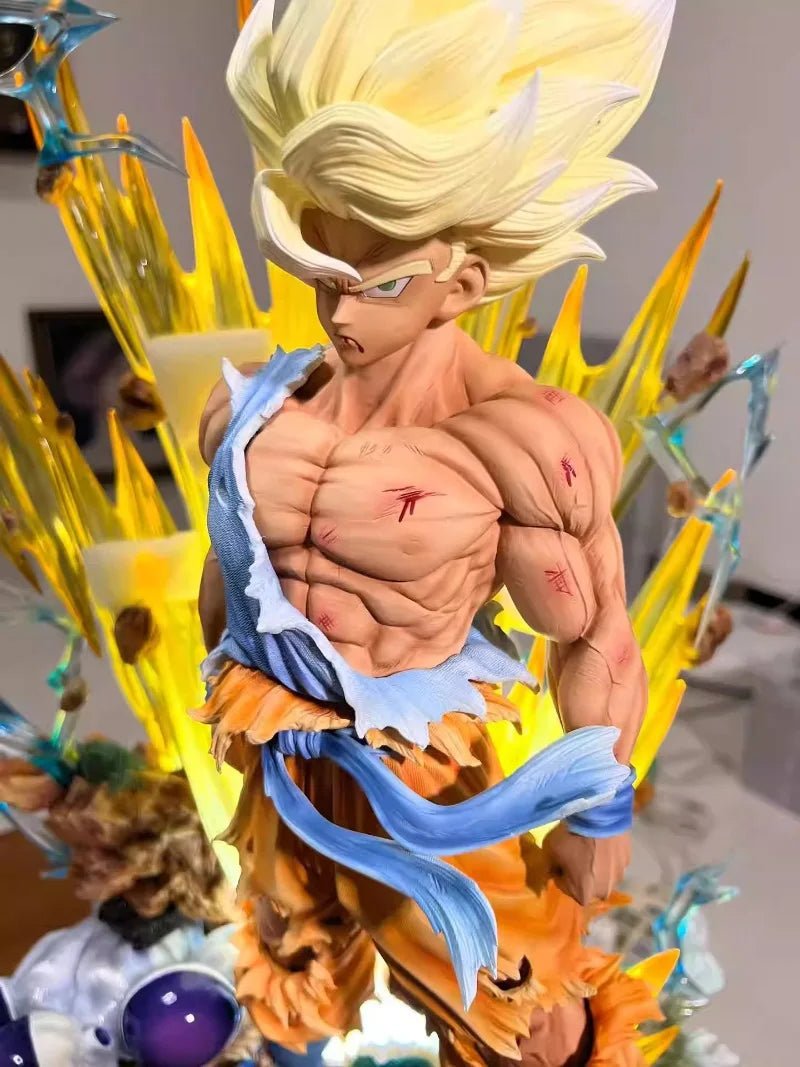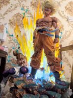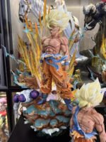Cette figurine représente une scène emblématique de Dragon Ball Z, où Goku, dans sa forme Super Saiyan, se tient fièrement sur le champ de bataille, démontrant sa force inébranlable et sa détermination à protéger ses proches et l’univers entier contre les forces du mal représentées par Freezer.