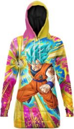 Si tu as envie de mettre en valeur tes formes tout en t’habillant aux couleurs de Dragon Ball Z, alors cette Robe Sweat Goku SSJ Blue sera parfaite pour ça !
