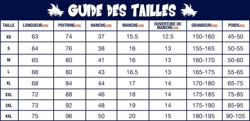 Référez-vous au guide des tailles ci-dessous. Il est conseillé de prendre 1 taille au-dessus de votre taille habituelle. NB : il s’agit des mesures du produit (qui est extensible), et non de vos mensurations !