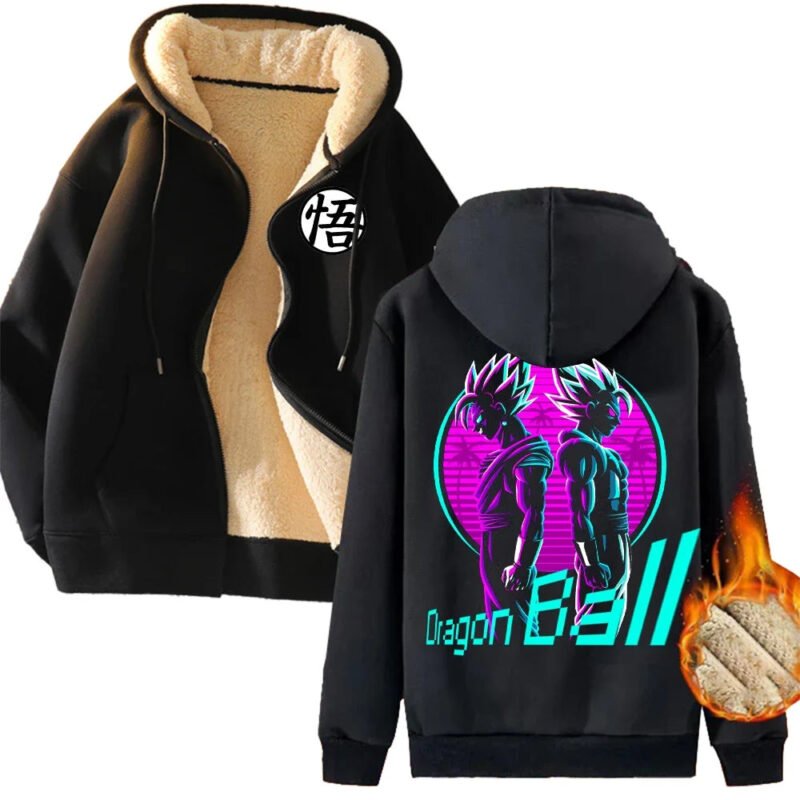 Fusion des Héros : La veste polaire présente Vegetto et Gogeta, les deux formes fusionnées de Goku et Vegeta, représentés de manière épique dos à dos. Chaque détail du design capture l’essence de la fusion, symbolisant la puissance incomparable de ces guerriers.