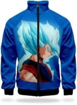 Adopte un look de sportif chevronné en compagnie de cette Veste Survêtement DBZ à l’effigie de Goku Super Saiyan Blue !